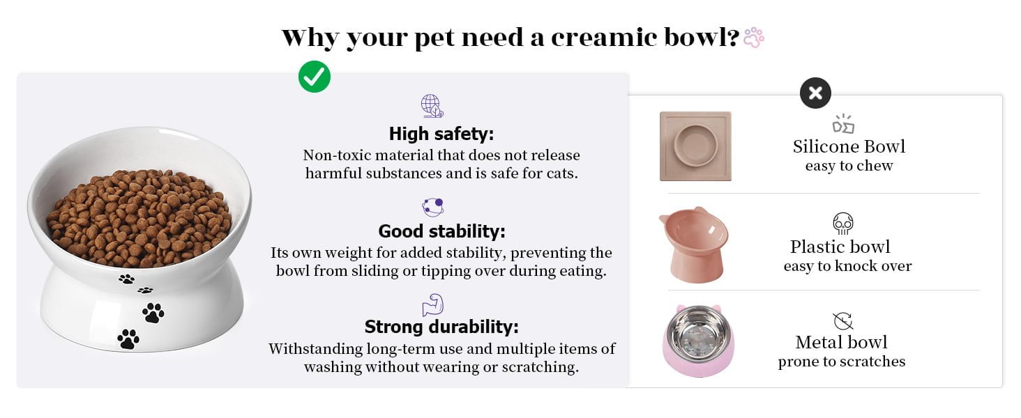 Ceramic cat bowls are easy to clean and won’t accumulate bacteria and residue. At the same time, our cat bowl is designed to be shallow and wide so that the cat’s chin and whiskers will not get food or water wet.