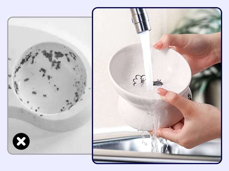 The surface of our ceramic cat bowls is generally smooth and non-stick. This makes food and water less likely to adhere to the surface of the bowl, making it easier to remove when you clean it. Can be hand washed or placed in the dishwasher. You can use a sponge or brush to gently scrub the surface.